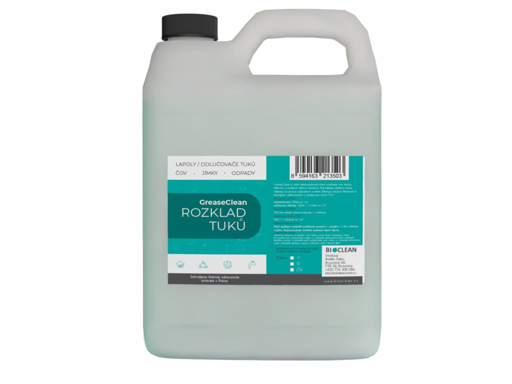 GreaseClean je biologický koncentrát vyvinutý pro účinný rozklad tuků v kuchyňských odpadech, odlučovačích tuků (LAPOL) a sběrných jímkách. Využívá vybrané mikroorganismy produkující enzymy a biosurfaktanty, které rozkládají tuky, škroby, bílkoviny a celulózu. Výsledkem je čistší odpadní potrubí, méně zápachu a snížení potřeby vývozů odlučovače tuků.